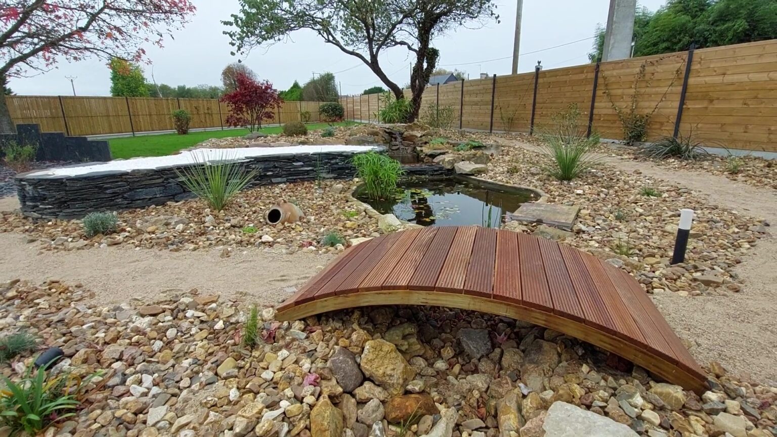 Le comparatif ci-dessous montre l’évolution impressionnante de l’espace mare en fontaine avec ruisseau sec japonisant avec végétalisation harmonieuse.